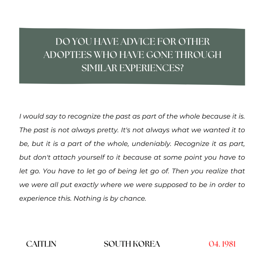 Well, if you haven’t gone back to South Korea, I definitely recommend that. It’s a big trip that I think every Korean adoptee should go on because it helps you identify where you were born, and what being Korean really means to us. Because growing up in America, we’re pretty much fully Americanized and I think that every Korean adoptee should go to visit South Korea if they can. And if you have those issues come up, just remind yourself that we’re special. Everyone has their own issues and I think our issues just make us special because not everyone can understand what we go through.