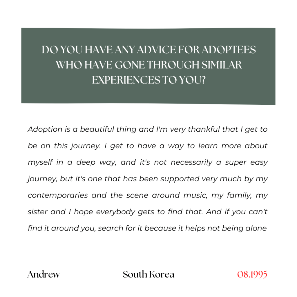 Because you can make contact with a biological parent and then never be able to see them because of their own world of shame and guilt and suffering. But if you go on this journey of discovering who you are as an adoptee, whether that’s trying to find biological relatives or putting yourself out there in adoptee communities. I think doing it in a way where you’re just being yourself and not putting so much pressure on this. “I have to be this adoptee, and I have to get these answers”, but more just to be there and be represented and comfortable. You’ll get so much more out of that, and it took me a while to get to that point.